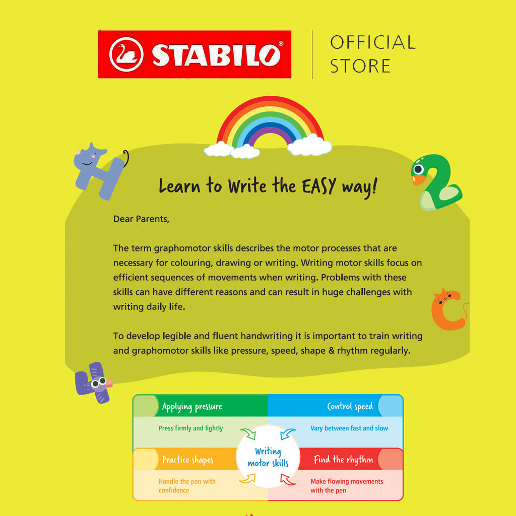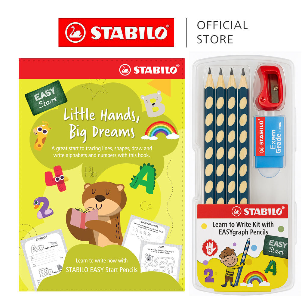 Help children take their first steps into writing with the STABILO EASYgraph Handwriting Kit! This complete set comes with jumbo-sized ergonomic 2B wooden pencils designed for little learners. With its unique triangular shape and left/right-handed grip zones, the EASYgraph ensures the correct finger placement and promotes confident, comfortable handwriting.